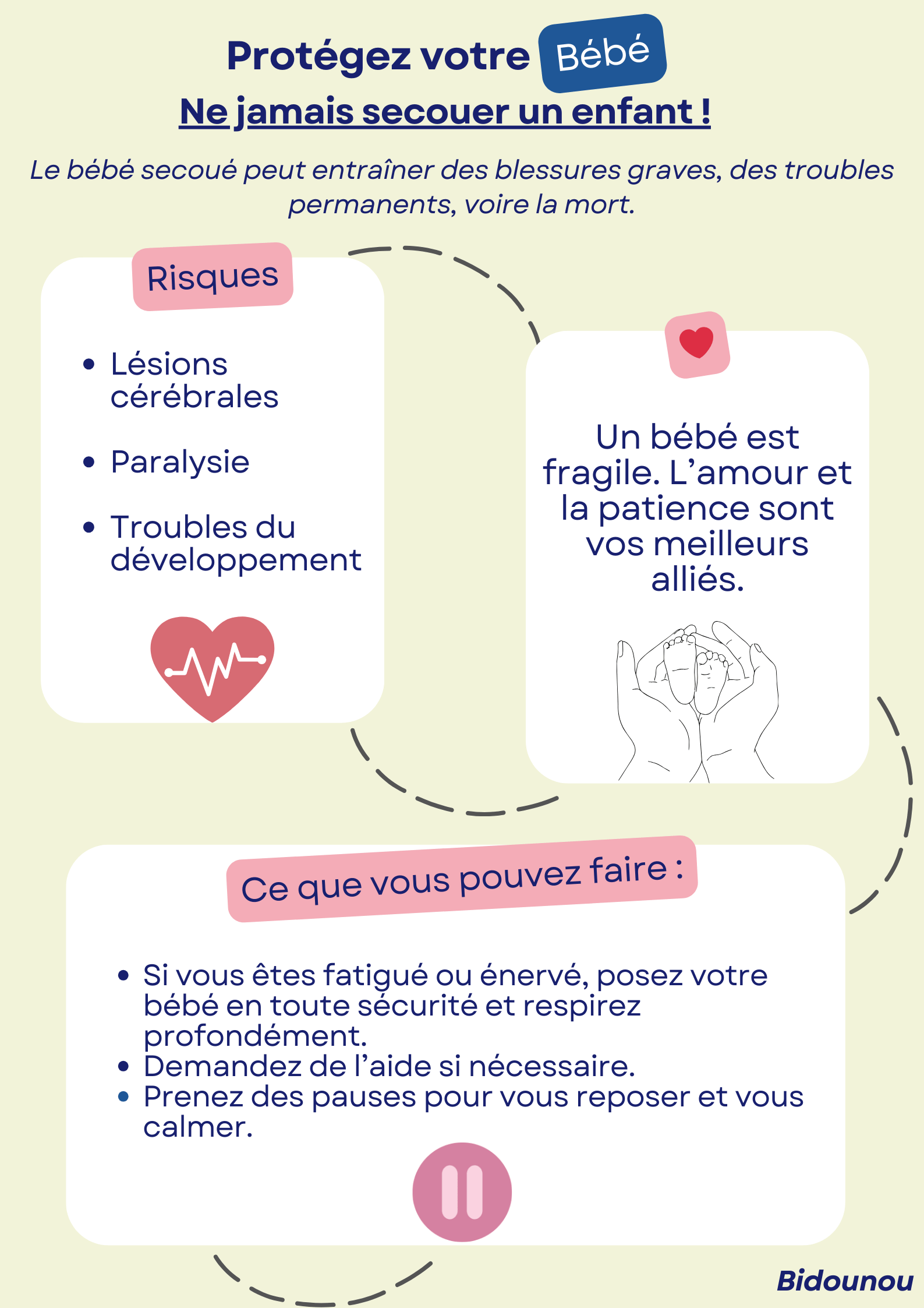 Le syndrome du bébé secoué est une forme grave de maltraitance infantile qui peut entraîner des dommages irréversibles ou la mort. Il est crucial d’éduquer les parents et les soignants sur les dangers du secouement des bébés et de fournir des ressources pour la gestion du stress parental. Avec la bonne information, le soutien familial et des stratégies de prévention, nous pouvons protéger les bébés de ce risque et promouvoir un environnement sûr et aimant pour leur développement.