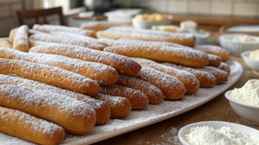 - Rouler chaque boule de pâte entre la main et le plan de travail pour former des boudins, aplatir et arrondir les bords pour obtenir une forme de boudoir. Un boudoir fait environ la taille de votre index. Ne pas trop aplatir pour garder une texture friable à l’intérieur.